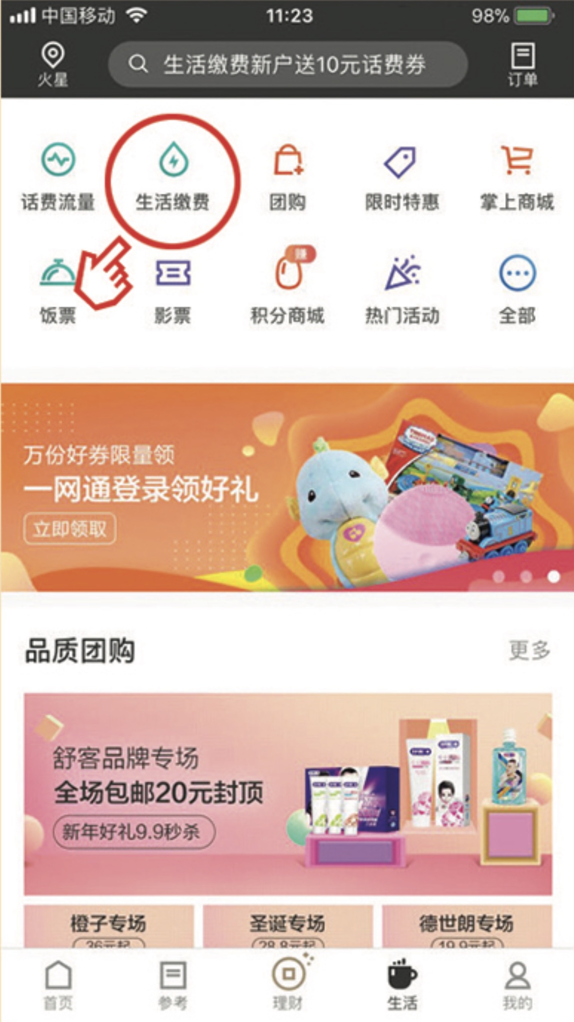 返回首頁后點(diǎn)擊下方“生活”頻道中“生活繳費(fèi)”按鈕