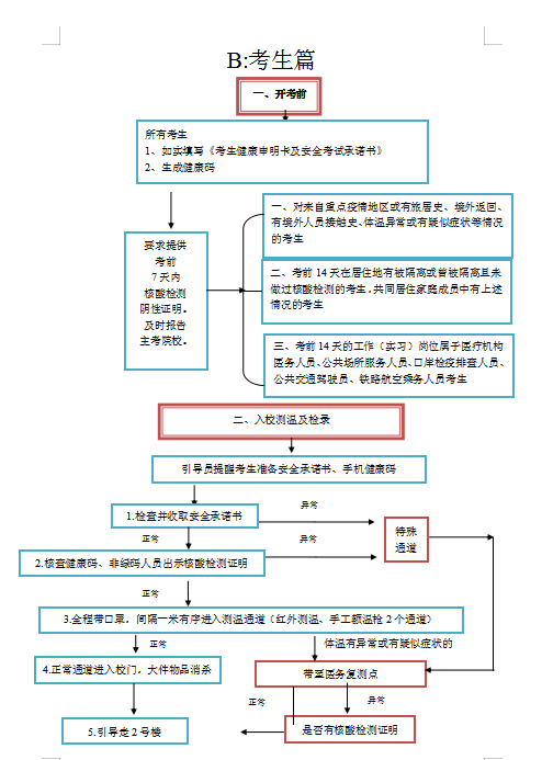 2.來自重點疫情地區(qū)或有旅居史、境外返回、境外人員接觸史、體溫異?;蛴幸伤瓢Y狀等情況,考前14天曾被隔離或曾被隔離未做過核酸檢測、共同居住家庭成員有上述情況的考生,考前14天的工作(實習(xí))崗位屬于醫(yī)療機構(gòu)醫(yī)務(wù)人員、公共場所服務(wù)人員、口岸檢疫排查人員、公共交通駕駛員或鐵路航空乘務(wù)人員的考生,上述考生須提供考前7天內(nèi)核酸檢測陰性證明后方可進入學(xué)校,無提供核酸證明者不得進入校園!