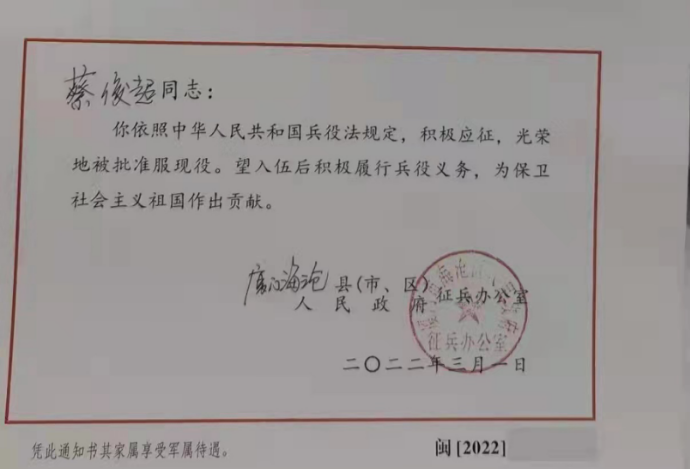 2022年1月,即將大學(xué)畢業(yè)的他毅然決定再次報(bào)名應(yīng)征,決定畢業(yè)季二次入伍,再續(xù)軍旅情緣,用自己的實(shí)際行動續(xù)寫保家衛(wèi)國的榮光。