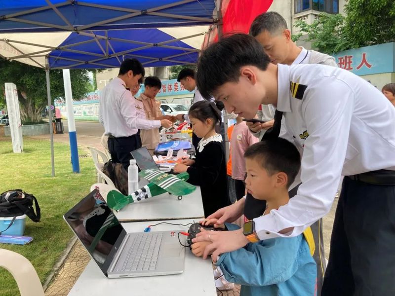 福建船政交通職業(yè)學(xué)院通用航空產(chǎn)業(yè)學(xué)院學(xué)生現(xiàn)場引導(dǎo)居民孩子制作航模、操作模擬飛行