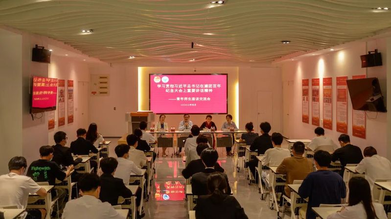 為學(xué)習(xí)貫徹習(xí)近平總書(shū)記在慶祝建團(tuán)100周年大會(huì)上的重要講話精神,2022年5月20日下午,學(xué)院團(tuán)委組織召開(kāi)青年師生座談交流會(huì),青年師生代表們?cè)邳h建思政館,再次學(xué)習(xí)習(xí)近平總書(shū)記在慶祝建團(tuán)100周年大會(huì)上的重要講話精神,暢談感受、交流學(xué)習(xí)心得。學(xué)院黨委副書(shū)記陳宜大、馬克思主義學(xué)院和團(tuán)委相關(guān)人員參加座談。