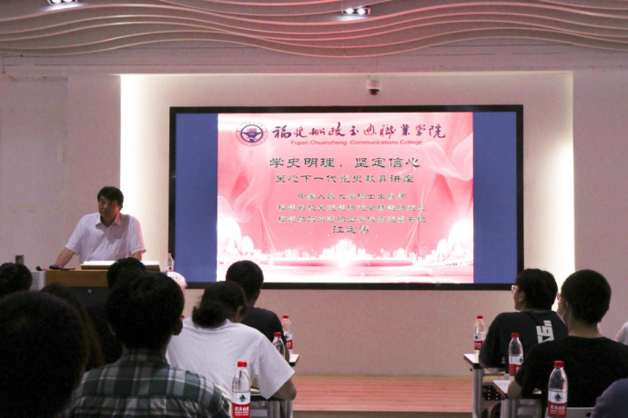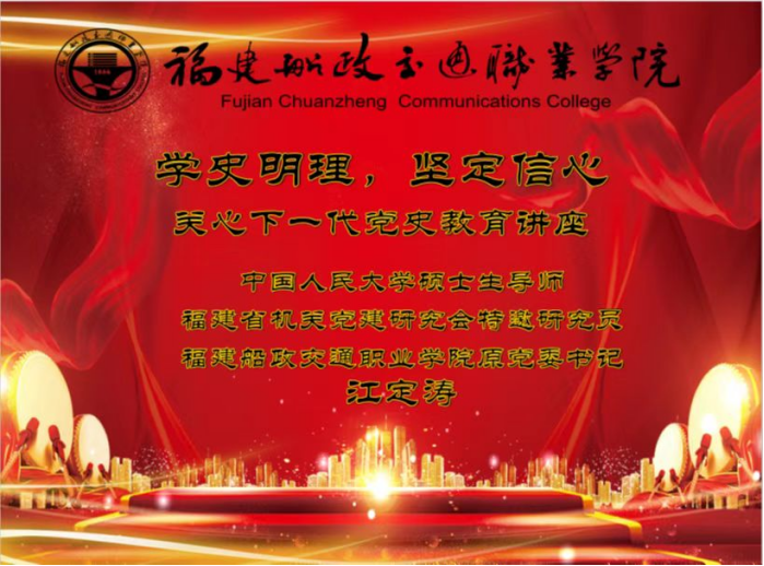 以史為鑒,開創(chuàng)未來。為推動黨史學(xué)習(xí)教育常態(tài)化長效化開展,以實(shí)際行動迎接黨的二十大勝利召開,2022年5月31日下午,學(xué)院關(guān)工委邀請“五老”代表、中國人民大學(xué)碩士生導(dǎo)師、福建省機(jī)關(guān)黨建研究會特邀研究員、福建船政交通職業(yè)學(xué)院原黨委書記江定濤做《學(xué)史明理 堅定信心》黨史學(xué)習(xí)教育專題講座。馬克思主義學(xué)院教師代表、習(xí)近平新時代中國特色社會主義思想讀書社、船政青年求是社、辯論協(xié)會、法學(xué)社等師生百余人參加講座。