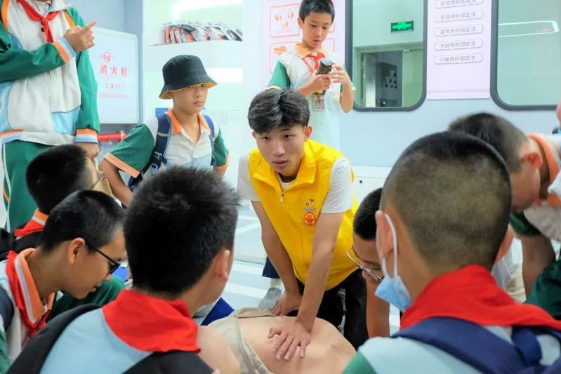 在活動(dòng)過(guò)程中,每個(gè)班級(jí)的小朋友們分成4組,在志愿者的引領(lǐng)下排好隊(duì)一項(xiàng)項(xiàng)體驗(yàn)。志愿者們流暢地講解著安全知識(shí),帶著小朋友們?cè)谳p松愉快的體驗(yàn)中學(xué)習(xí)到實(shí)用的安全技能。