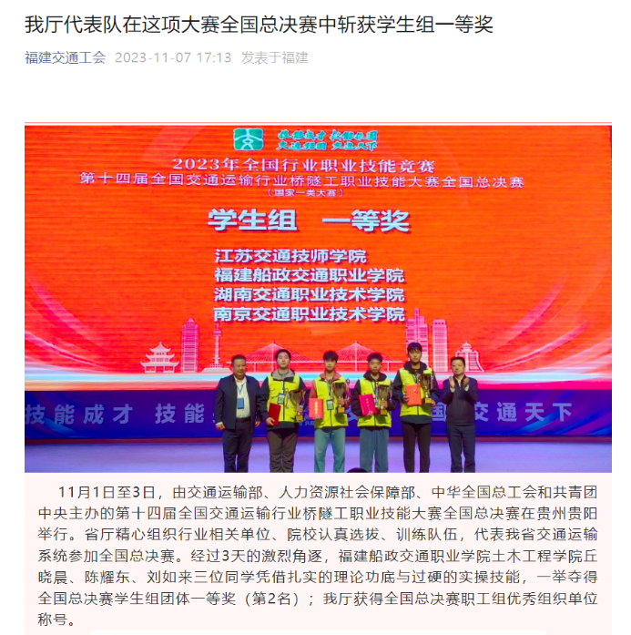 日前,福建交通工會報道了我省在2023年全國行業(yè)職業(yè)技能競賽——第十四屆全國交通運輸行業(yè)橋隧工職業(yè)技能大賽全國總決賽(國家一類大賽)中獲獎情況。作為我省交通運輸系統(tǒng)代表隊,我院獲全國總決賽學生組團體一等獎(第2名),充分展示了我院培養(yǎng)交通運輸高素質(zhì)技能人才的有效成果,為全面加快建設交通強省提供了堅強的后備人才保障。