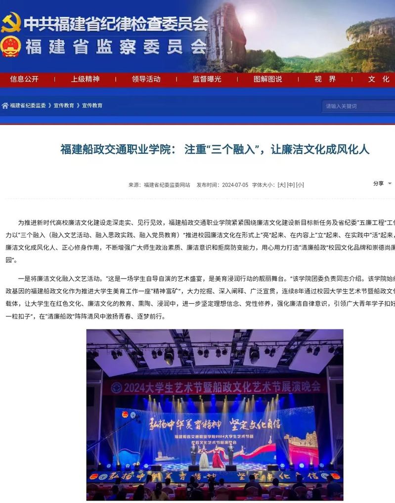 為推進新時代高校廉潔文化建設走深走實、見行見效,福建船政交通職業(yè)學院緊緊圍繞廉潔文化建設新目標新任務及省紀委“五廉工程”工作部署,著力以“三個融入(融入文藝活動、融入思政實踐、融入黨員教育)”推進校園廉潔文化在形式上“亮”起來、在內容上“立”起來、在實踐中“活”起來,切實發(fā)揮廉潔文化成風化人、正心修身作用,不斷增強廣大師生政治素質、廉潔意識和拒腐防變能力,用心用力打造“清廉船政”校園文化品牌和崇德尚廉的“清清校園”。