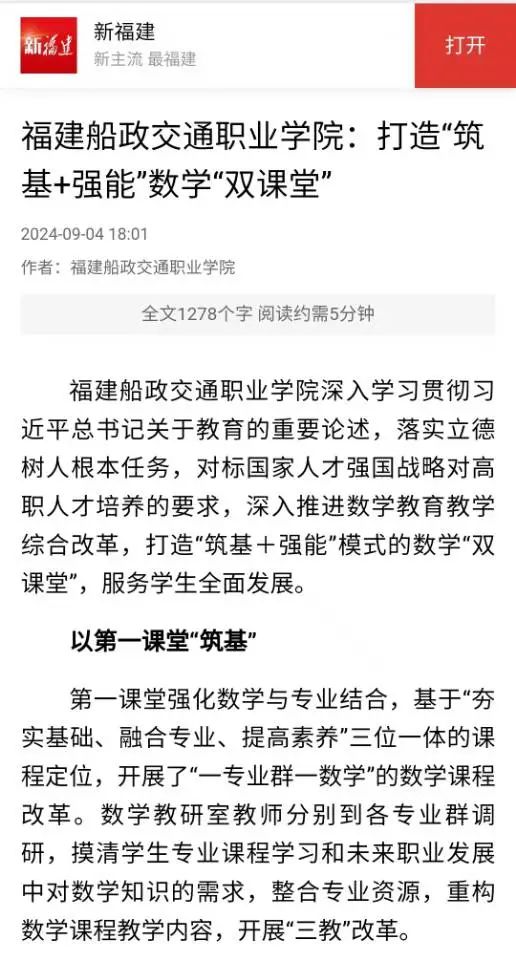 福建船政交通職業(yè)學(xué)院深入學(xué)習(xí)貫徹習(xí)近平總書記關(guān)于教育的重要論述,落實(shí)立德樹人根本任務(wù),對(duì)標(biāo)國(guó)家人才強(qiáng)國(guó)戰(zhàn)略對(duì)高職人才培養(yǎng)的要求,深入推進(jìn)數(shù)學(xué)教育教學(xué)綜合改革,打造“筑基+強(qiáng)能”模式的數(shù)學(xué)“雙課堂”,服務(wù)學(xué)生全面發(fā)展。