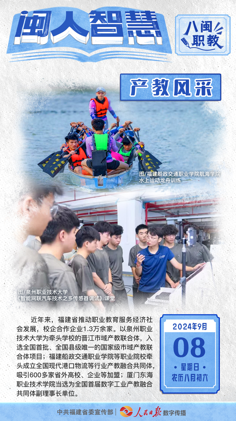 近期,中共福建省委宣傳部和人民日報數(shù)字傳播共同出品的《閩人智慧》日簽欄目特別策劃推出八閩職教系列,圍繞院校風(fēng)采、產(chǎn)教風(fēng)采、學(xué)生風(fēng)采、服務(wù)風(fēng)采、創(chuàng)業(yè)風(fēng)采、工匠風(fēng)采等主題展現(xiàn)福建如何賡續(xù)優(yōu)良傳統(tǒng),培養(yǎng)高素質(zhì)技術(shù)技能人才,讓職業(yè)教育成果在八閩大地落地開花。