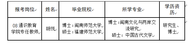 按照《關于印發(fā)<福建省省屬事業(yè)單位公開招聘工作人員考試暫行辦法>的通知》(閩人發(fā)〔2006〕11號)和《2024年福建船政交通職業(yè)學院專項公開招聘總量控制高層次人才方案(二)》等文件要求,經報名、資格審查、面試、考察、體檢等有關程序,經學校黨委會議研究,確定胡悅為08通識教育學院專任教師擬聘用人員,現予以公示。