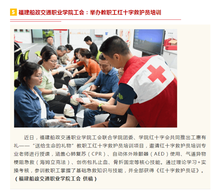 4月29日,我院工會(huì)聯(lián)合學(xué)院團(tuán)委、學(xué)院紅十字會(huì)共同推出的工惠有禮——“送給生命的禮物”首期教職工紅十字救護(hù)員培訓(xùn)活動(dòng)圓滿(mǎn)結(jié)束。福建省總工會(huì)官方微信公眾號(hào)對(duì)我院活動(dòng)進(jìn)行報(bào)道: