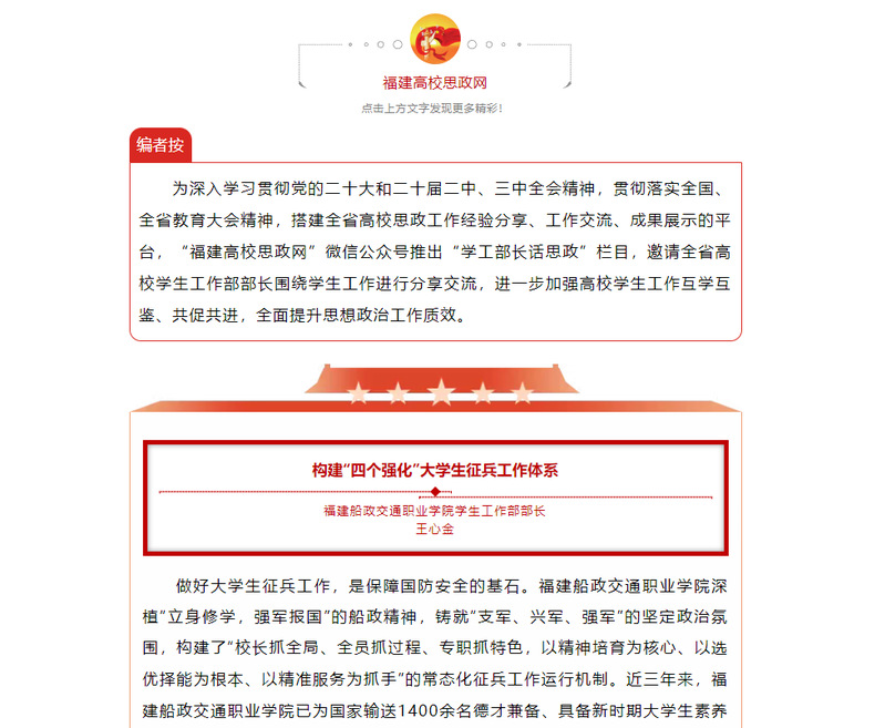 為深入學(xué)習(xí)貫徹黨的二十大和二十屆二中、三中全會(huì)精神,貫徹落實(shí)全國、全省教育大會(huì)精神,搭建全省高校思政工作經(jīng)驗(yàn)分享、工作交流、成果展示的平臺(tái),“福建高校思政網(wǎng)”微信公眾號(hào)推出“學(xué)工部長(zhǎng)話思政”欄目,邀請(qǐng)全省高校學(xué)生工作部部長(zhǎng)圍繞學(xué)生工作進(jìn)行分享交流,進(jìn)一步加強(qiáng)高校學(xué)生工作互學(xué)互鑒、共促共進(jìn),全面提升思想政治工作質(zhì)效。
