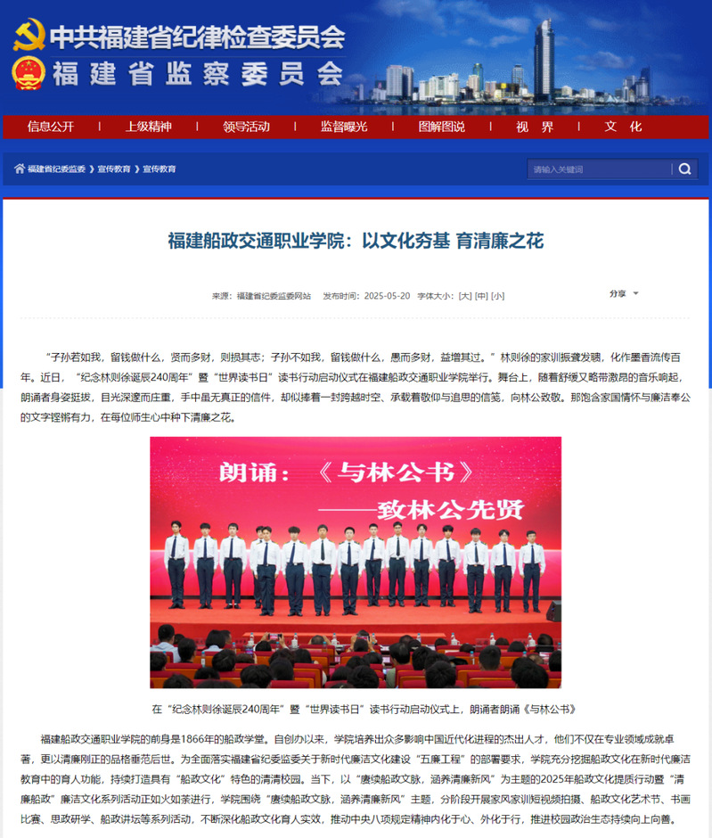 福建船政交通職業(yè)學院的前身是1866年的船政學堂。自創(chuàng)辦以來,學院培養(yǎng)出眾多影響中國近代化進程的杰出人才,他們不僅在專業(yè)領域成就卓著,更以清廉剛正的品格垂范后世。為全面落實福建省紀委監(jiān)委關于新時代廉潔文化建設“五廉工程”的部署要求,學院充分挖掘船政文化在新時代廉潔教育中的育人功能,持續(xù)打造具有“船政文化”特色的清清校園。當下,以“賡續(xù)船政文脈,涵養(yǎng)清廉新風”為主題的2025年船政文化提質(zhì)行動暨“清廉船政”廉潔文化系列活動正如火如荼進行,學院圍繞“賡續(xù)船政文脈,涵養(yǎng)清廉新風”主題,分階段開展家風家訓短視頻拍攝、船政文化藝術(shù)節(jié)、書畫比賽、思政研學、船政講壇等系列活動,不斷深化船政文化育人實效,推動中央八項規(guī)定精神內(nèi)化于心、外化于行,推進校園政治生態(tài)持續(xù)向上向善。