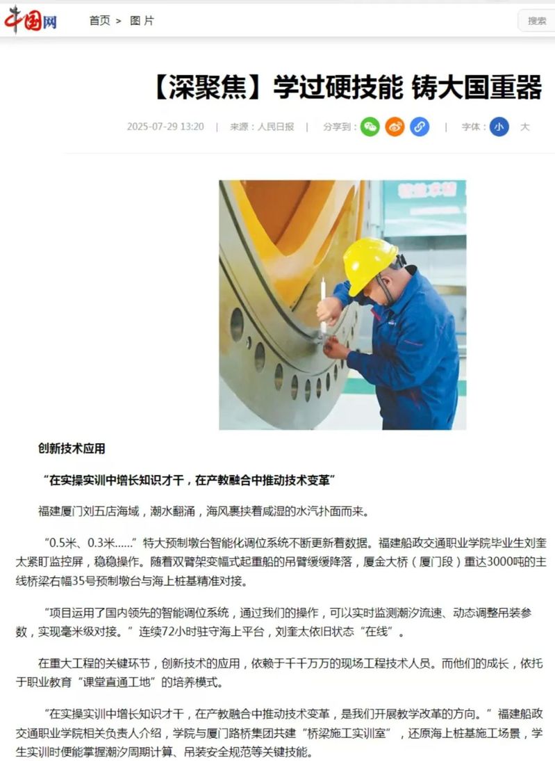 7月29日,人民網(wǎng)、新華網(wǎng)、光明網(wǎng)、中國網(wǎng)等中央主流媒體報道我院畢業(yè)生劉奎太參與廈金大橋(廈門段)建設(shè),展現(xiàn)學(xué)院在產(chǎn)教融合育人方面所取得的顯著成效。具體報道情況如下: