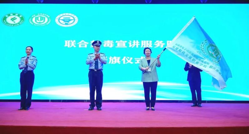 省女子司法強制隔離戒毒所向我院授予“聯(lián)合禁毒宣講服務(wù)隊”旗幟,張輝代表學(xué)院接旗。