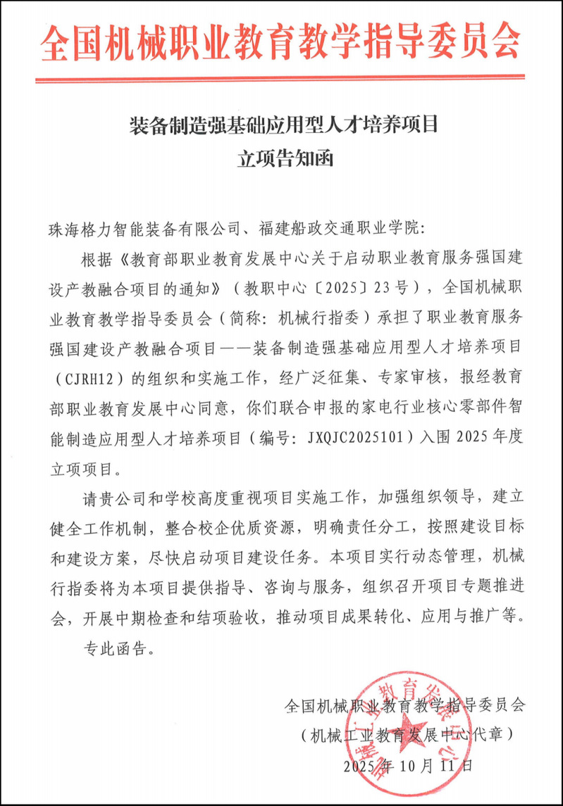 近日,全國機(jī)械職業(yè)教育教學(xué)指導(dǎo)委員會(huì)發(fā)布通知,我院聯(lián)合珠海格力智能裝備有限公司共同申報(bào)的“家電行業(yè)核心零部件智能制造應(yīng)用型人才培養(yǎng)項(xiàng)目”入選職業(yè)教育服務(wù)強(qiáng)國建設(shè)產(chǎn)教融合項(xiàng)目——裝備制造強(qiáng)基礎(chǔ)應(yīng)用型人才培養(yǎng)項(xiàng)目。
