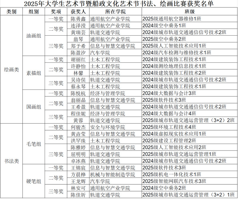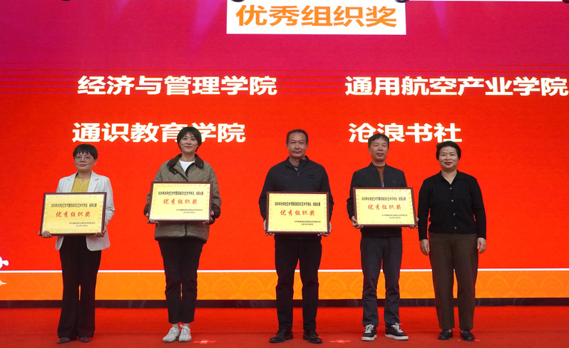 頒獎(jiǎng)會(huì)上,還為獲得油畫、素描、國(guó)畫、毛筆、硬筆五個(gè)組別的一、二、三等獎(jiǎng)的27名學(xué)生頒發(fā)獲獎(jiǎng)證書,并授予經(jīng)濟(jì)與管理學(xué)院、通用航空產(chǎn)業(yè)學(xué)院、通識(shí)教育學(xué)院、滄浪書社“優(yōu)秀組織獎(jiǎng)”。
