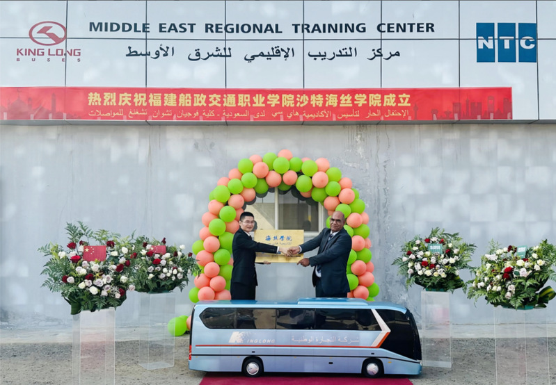 12月26日,福建船政交通職業(yè)學(xué)院與廈門金龍聯(lián)合汽車工業(yè)有限公司共建的沙特“海絲學(xué)院”在沙特阿拉伯王國(guó)吉達(dá)舉行揭牌儀式。廈門金龍沙特公司總經(jīng)理黃初俊、中東服務(wù)大區(qū)經(jīng)理王瓊,沙特NTC(National Trade Company LTD)公司銷售總監(jiān)亞瑟、售后服務(wù)經(jīng)理伊斯梅爾,汽車學(xué)院院長(zhǎng)蘇慶列、汽車實(shí)訓(xùn)中心主任黃知秋以及當(dāng)?shù)?0位學(xué)員等參加了揭牌儀式。