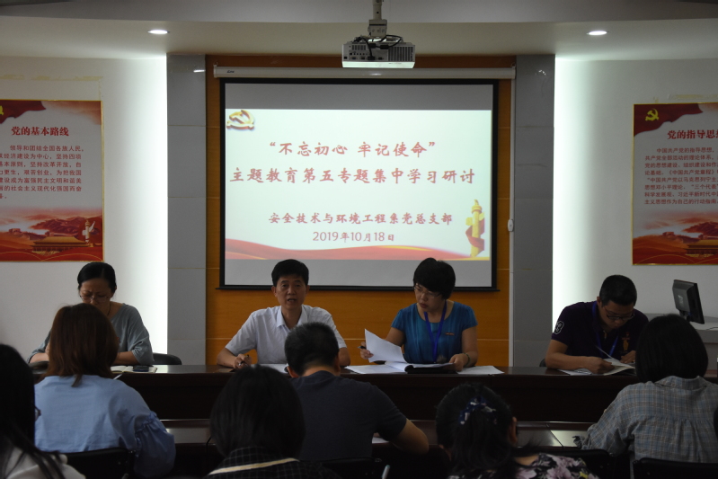 根據(jù)安全技術(shù)與環(huán)境工程系黨總支“不忘初心、牢記使命”主題教育學習研討方案安排,10月18日下午,安全技術(shù)與環(huán)境工程系召開主題教育第五專題集中學習研討會。