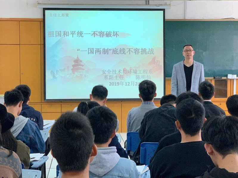 2019年12月24日下午,安全技術(shù)與環(huán)境工程系副主任陳明仙博士在科技樓801教室為安全技術(shù)與環(huán)境工程系各專業(yè)班級干部作了題為“祖國和平統(tǒng)一不容破壞、‘一國兩制’底線不容挑戰(zhàn)”的形式與政策報告。