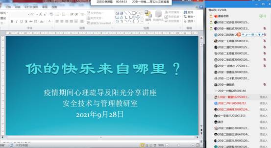 為幫助學(xué)生們以更加理性平和的心態(tài)應(yīng)對(duì)疫情,安全與環(huán)境學(xué)院第二黨支部黨員突擊隊(duì)利用微信群、QQ群及相關(guān)新媒體,推薦和分享優(yōu)質(zhì)學(xué)習(xí)資源,開展在線研討,積極傳播正能量。潘瑜老師通過網(wǎng)絡(luò)平臺(tái)向20級(jí)在校生開展“疫情期間心理疏導(dǎo)及陽光分享講座”,使全體學(xué)生知曉、理解和配合疫情防控工作,以積極、樂觀的心態(tài)面對(duì)疫情,以頑強(qiáng)的意志、堅(jiān)定的信念戰(zhàn)勝疫情。