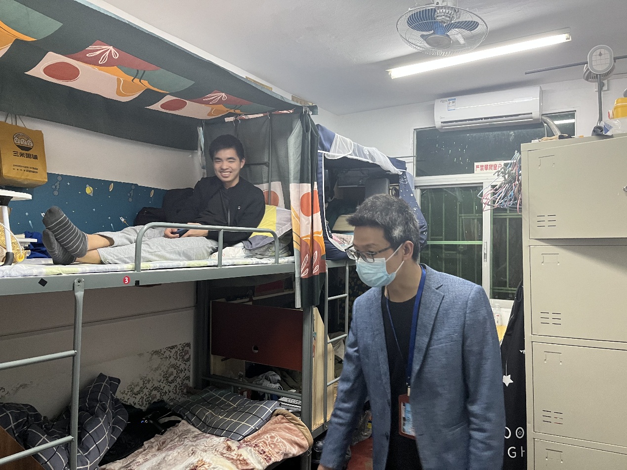 陳明仙院長實地查看和了解了同學(xué)們第一天線上學(xué)習(xí)狀況、宿舍衛(wèi)生狀況、防疫措施、通風(fēng)情況等。與學(xué)生進(jìn)行親切交流,傾聽學(xué)生心聲,關(guān)心學(xué)生身心健康,了解學(xué)生需求與困難,要求學(xué)生干部特別是入黨積極分子要在校園疫情工作中發(fā)揮先鋒模范作用,勉勵學(xué)生克服當(dāng)前困難,全力配合學(xué)校做好校園疫情防控,盡快適應(yīng)線上學(xué)習(xí)生活,端正學(xué)習(xí)態(tài)度,規(guī)范學(xué)習(xí)行為,更加自覺自律地按照學(xué)校要求進(jìn)行學(xué)習(xí)。