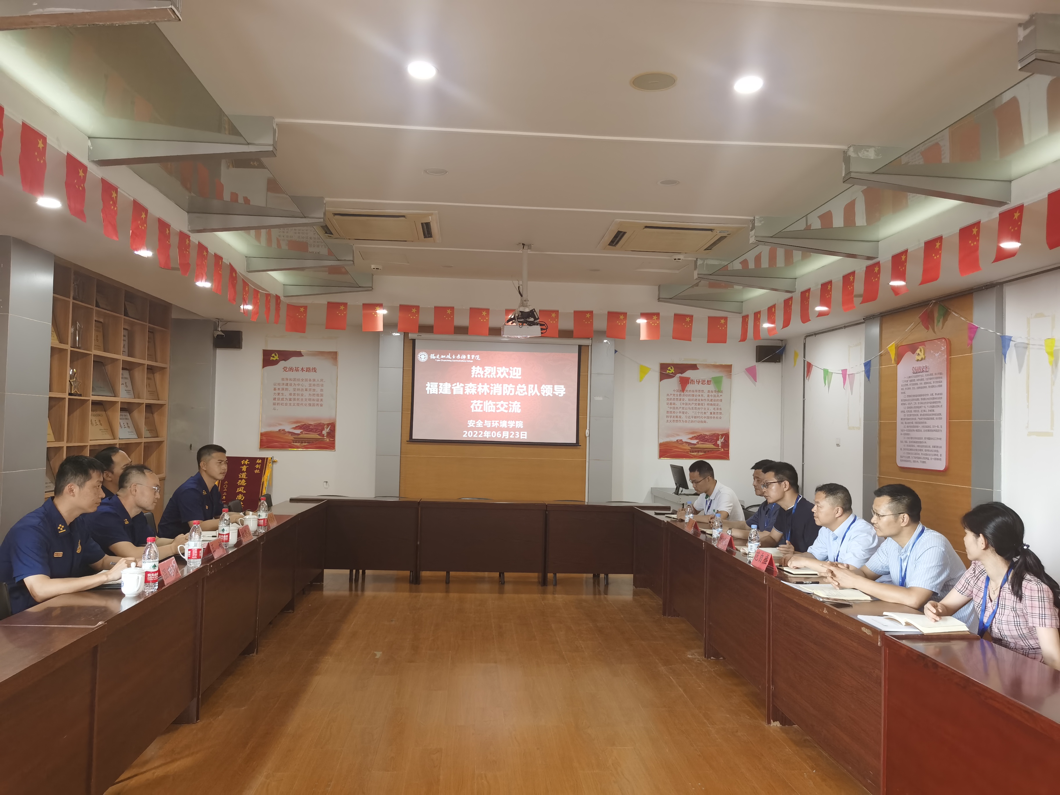 2022年6月23日下午,福建省森林消防總隊政治部副主任王斌、隊務(wù)處二級督導(dǎo)員林堅成、訓(xùn)練大隊教導(dǎo)員溫曉明、教員林會椿一行四人蒞臨福建船政交通職業(yè)學(xué)院安全與環(huán)境學(xué)院進行調(diào)研交流。學(xué)院院長陳明仙、副院長陳榕、副院長范自盛、辦公室主任陳敏以及教研室主任、骨干教師等參加會議。