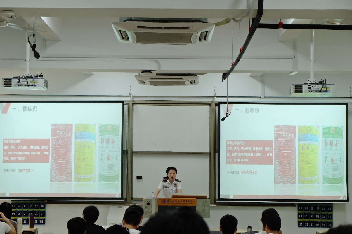 蔡晶菁高工向同學(xué)們介紹了建筑滅火器的發(fā)展歷史,滅火器的種類,滅火級別;講述了如何做好滅火器的市場準(zhǔn)入檢查,滅火器配置需要考慮的要素;講解通過滅火器筒體鋼印和標(biāo)志辨識是否符合配置要求,超過有效期的滅火器爆炸隱患等,并與同學(xué)們進(jìn)行了互動交流,分享從事消防一線工作的經(jīng)驗。