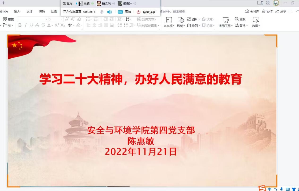 2022年11月21日晚上,安全與環(huán)境學院第四黨支部副書記陳惠敏在線上為支部全體黨員教師開展了“學習黨的二十大精神,辦好人民滿意的教育”講座。講座結合應急救援技術專業(yè)的建設,從黨的二十大的內容和精神、努力推動職業(yè)教育高質量發(fā)展的若干思考進行宣講。