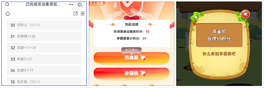 我院于6月19日接到通知的第一時(shí)間,將《福建省防范和處置非法集資工作領(lǐng)導(dǎo)小組辦公室轉(zhuǎn)發(fā)處置非法集資部際聯(lián)席會(huì)議辦公室關(guān)于邀請(qǐng)參加第三屆全國防范非法集資知識(shí)答題賽的函》發(fā)布工作群中,鼓勵(lì)教職工積極參加熱身賽,多位老師在熱身賽中獲得滿分50分。