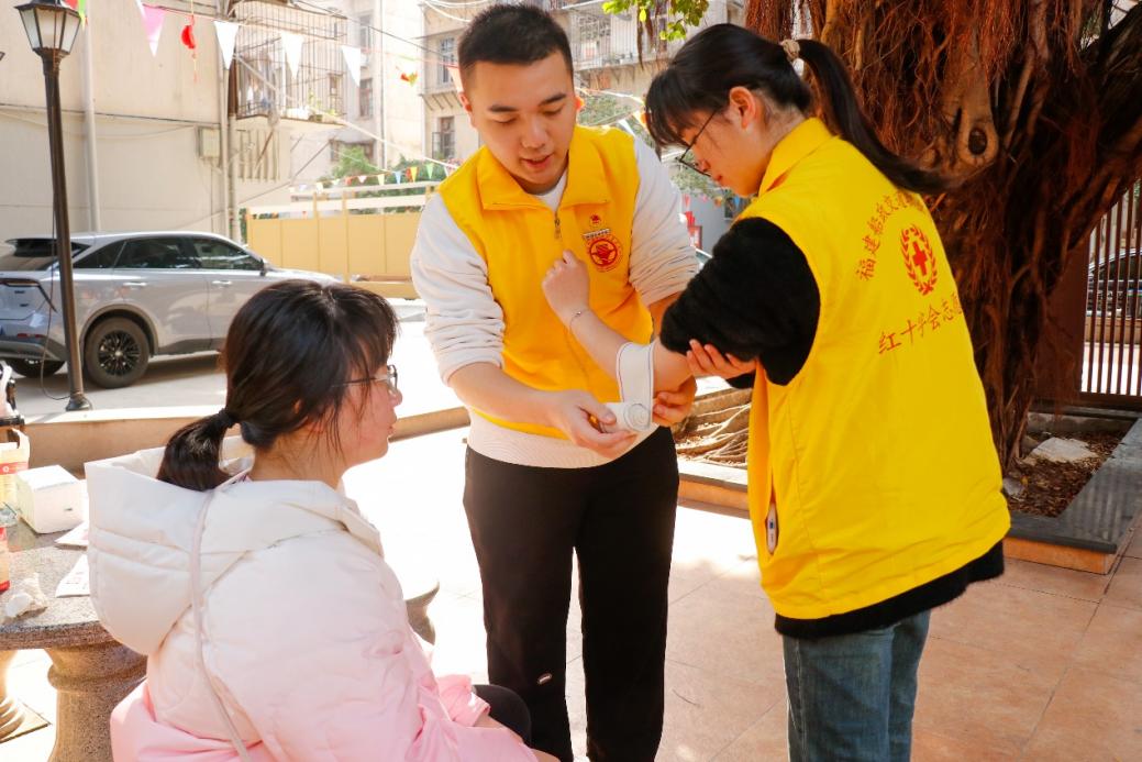 志愿者先向居民講解有關(guān)心肺復(fù)蘇救護(hù)、海姆立克急救法和包扎的基本常識(shí)與應(yīng)用環(huán)境,隨后居民在志愿者們的協(xié)助下進(jìn)行實(shí)操,如在仿真人體上演練心肺復(fù)蘇和海姆立克急救法,真人練習(xí)三角巾包扎,讓居民們對(duì)于急救知識(shí)有了深入的了解。