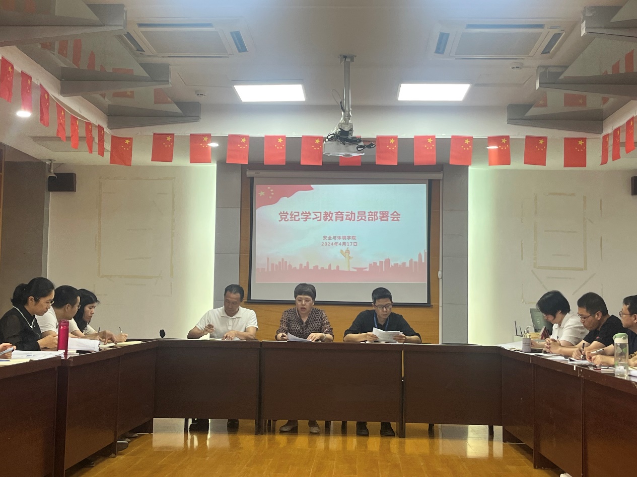 4月17日下午,安全與環(huán)境學(xué)院黨紀(jì)學(xué)習(xí)教育動(dòng)員部署會(huì)在創(chuàng)新樓909會(huì)議室召開(kāi)。會(huì)議傳達(dá)學(xué)習(xí)習(xí)近平總書(shū)記關(guān)于開(kāi)展黨紀(jì)學(xué)習(xí)教育的重要講話(huà)和重要指示精神、學(xué)院黨委擴(kuò)大會(huì)議關(guān)于在全黨開(kāi)展黨紀(jì)學(xué)習(xí)教育的通知精神,對(duì)我院黨紀(jì)學(xué)習(xí)教育作了安排部署。學(xué)院黨政領(lǐng)導(dǎo)班子、全體教職工參加會(huì)議,會(huì)議由學(xué)院黨總支書(shū)記鄭雪琴主持。