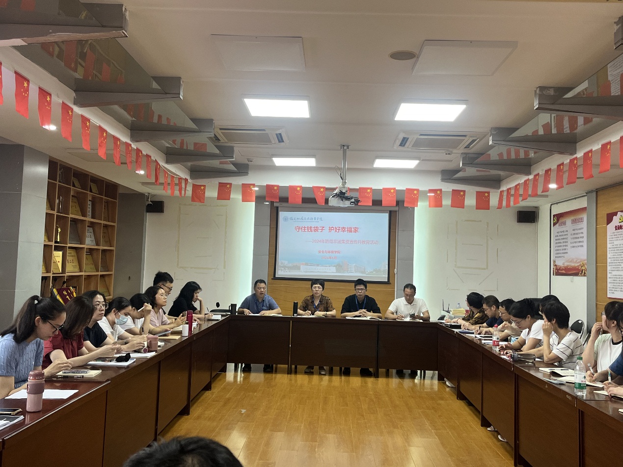 為了進(jìn)一步推動(dòng)常態(tài)化防范非法集資宣傳教育工作,切實(shí)提升安全與環(huán)境學(xué)院全體教職工對(duì)非法集資的防范能力和意識(shí),安全與環(huán)境學(xué)院于 2024年 6 月12日下午開展了“守住錢袋子、護(hù)好幸福家”為主題的防范非法集資宣傳活動(dòng)。