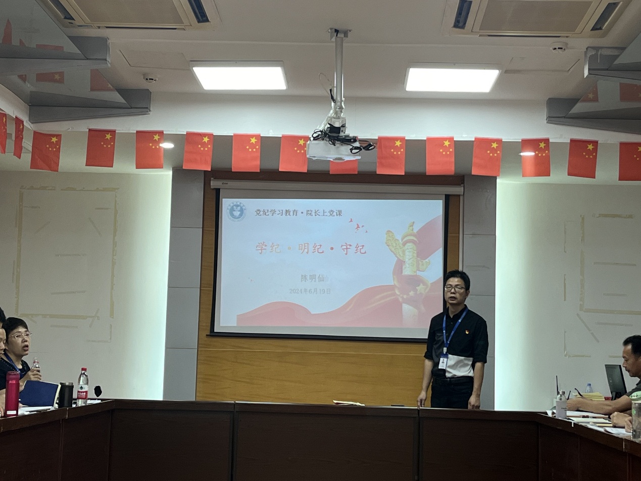最后,陳明仙院長以《學紀、明紀、守紀》為題講授黨紀學習教育專題黨課。陳明仙院長強調:我們作為教育工作者承擔著立德樹人、培養(yǎng)社會主義建設者和接班人的重任,平時要結合教育教學業(yè)務、黨組織和黨員干部的實際,真正做到內化學紀、師德明紀、規(guī)矩守紀,在推動教育高質量發(fā)展中要發(fā)揮模范帶頭作用。