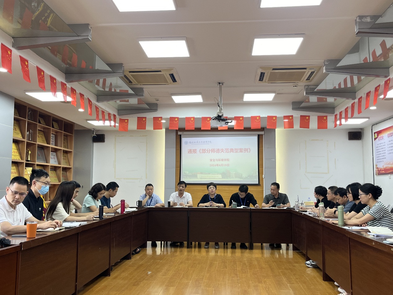 為深入貫徹落實黨的二十大精神,加強師德師風建設,嚴明底線意識,規(guī)范教師職業(yè)行為,營造風清氣正的育人環(huán)境,6月19日下午,安全與環(huán)境學院召開黨紀學習教育暨師德師風專題警示教育會。會議由黨總支書記鄭雪琴同志主持,學院全體教師參加。