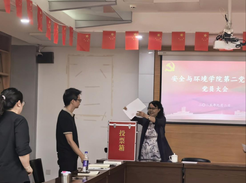 圖為黨委副書記、院長(zhǎng)陳群以普通黨員身份參加安全與環(huán)境學(xué)院第二黨支部黨員大會(huì)并投下神圣一票