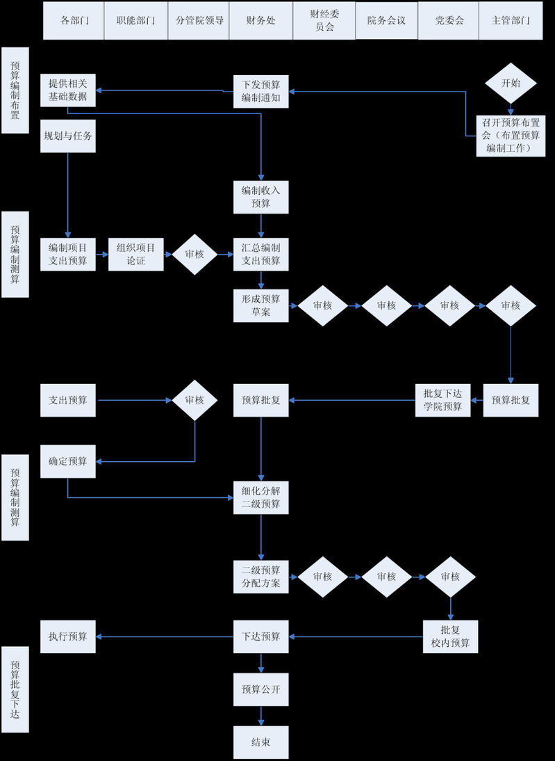 職能部門審核意見 → 分管院領(lǐng)導(dǎo)審批 → 院領(lǐng)導(dǎo)審批 → 院務(wù)會(huì)議審議 → 財(cái)務(wù)處根據(jù)指示調(diào)整。