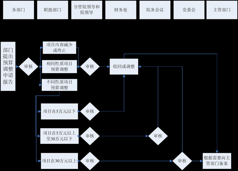 職能部門審核意見 → 分管院領(lǐng)導(dǎo)審批 → 院領(lǐng)導(dǎo)審批 → 黨委會(huì)議審議 → 財(cái)務(wù)處根據(jù)指示調(diào)整 → 根據(jù)需要向上級主管部門備案。