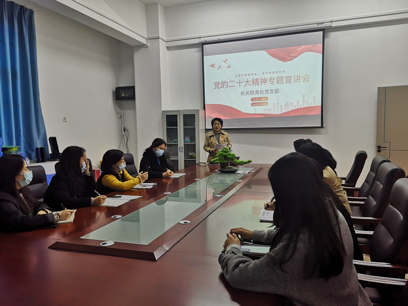 為深入學習宣傳貫徹黨的二十大精神,更好團結(jié)引領(lǐng)廣大干部職工緊跟黨奮進新征程,奪取新勝利,12月9日下午,機關(guān)財務(wù)處黨支部在行政樓一樓評標室舉行“矢志不渝跟黨走,攜手奮進新時代——學習貫徹黨的二十大精神宣講會”。黨支部書記龔玲帶領(lǐng)財務(wù)處全體干部職工齊聚一堂,共同學習領(lǐng)會黨的二十大精神。本次活動采用“現(xiàn)場宣講”的形式進行。