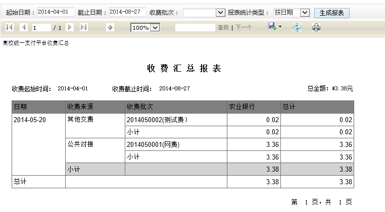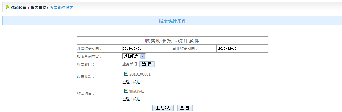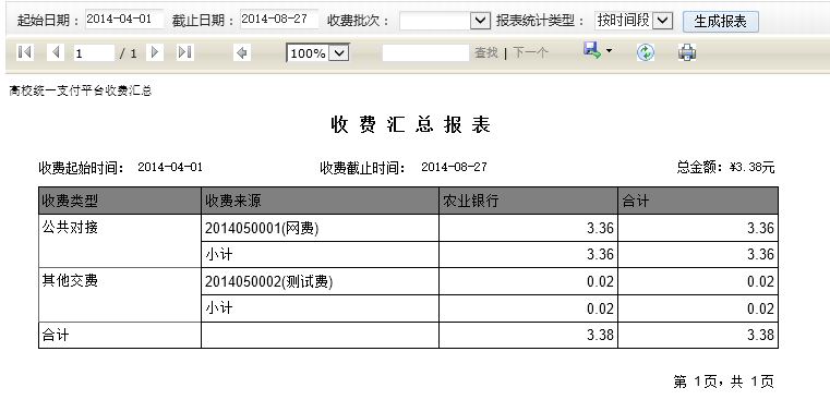 選擇需要生成報(bào)表的時(shí)間段、收費(fèi)批次以及需要生成的統(tǒng)計(jì)類型,點(diǎn)擊生成報(bào)表按鈕。如圖4.4.3-2、4.4-3所示: