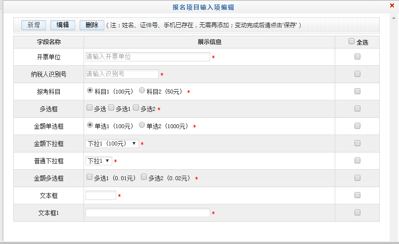 (1)此位置可以自定義報(bào)名選項(xiàng),可約束學(xué)生在報(bào)名時(shí)是否是必填或選填;