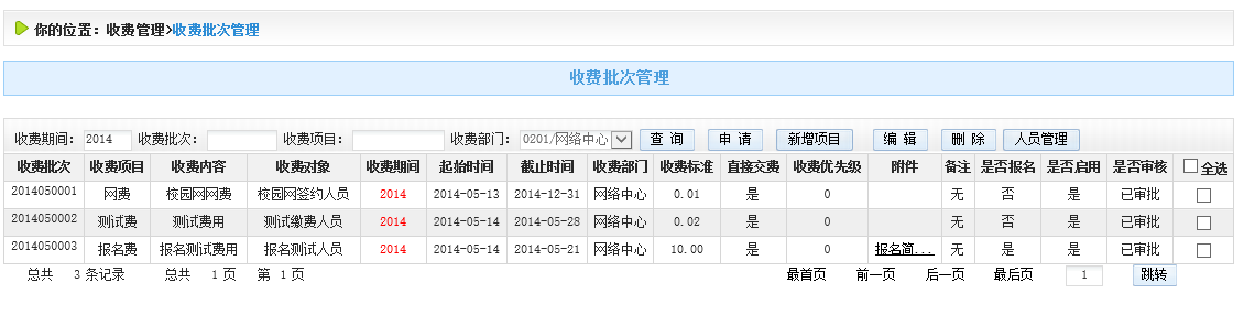收費(fèi)批次管理包括:收費(fèi)批次申請、查詢、新增項(xiàng)目、編輯和刪除等功能。如圖4.2.2-1所示: