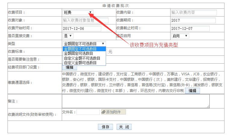 5)收費(fèi)類型:充值——對應(yīng)前臺項(xiàng)目為生活繳費(fèi),使用場景:可以允許學(xué)生重復(fù)繳費(fèi)的項(xiàng)目,比如一卡通補(bǔ)卡費(fèi)、停車費(fèi)。