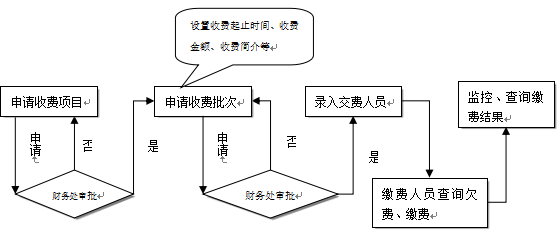 收費(fèi)部門收費(fèi)流程:申請收費(fèi)項(xiàng)目——>等待財(cái)務(wù)處審批——>使用已審批項(xiàng)目申請收費(fèi)批次(制定具體交費(fèi)時(shí)間、交費(fèi)標(biāo)準(zhǔn)等)——>等待財(cái)務(wù)處審批——>向已審批的收費(fèi)批次中導(dǎo)入收費(fèi)人員信息——>監(jiān)控收費(fèi)狀況——>查詢交費(fèi)結(jié)果——>交費(fèi)結(jié)束。如下圖: