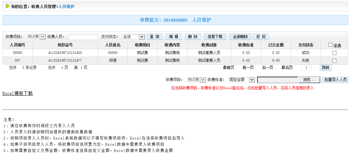 1)人員編號、人員姓名必須填寫,建議錄入身份證號,以供繳費(fèi)人員確認(rèn)信息。