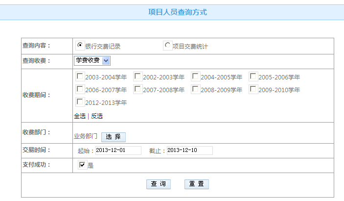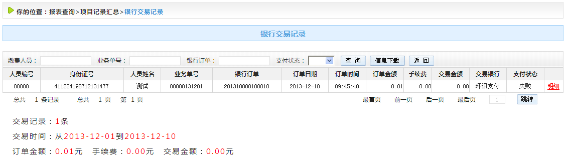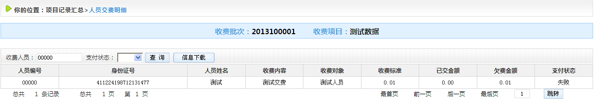選擇收費(fèi)項(xiàng)目,輸入人員姓名、編號、身份證號以及支付狀態(tài),點(diǎn)擊