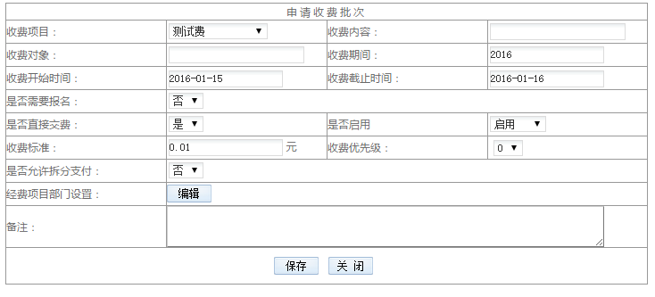 3)收費(fèi)開始、截止時(shí)間:定義收費(fèi)起止時(shí)間,學(xué)生只能在該期間內(nèi)繳費(fèi)。