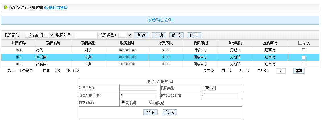 收費(fèi)項(xiàng)目管理包括:收費(fèi)項(xiàng)目申請、查詢、編輯和刪除等功能。如圖4.2.1-1所示: