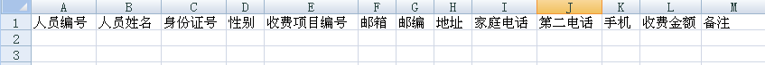 Excel模板包括人員編號、人員姓名、身份證號、性別、收費(fèi)項(xiàng)目編號、郵箱、郵編、地址、家庭電話、第二電話、手機(jī)、交易金額、備注13條信息如圖4.3-7所示: