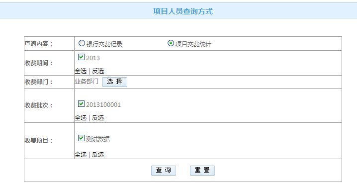 項(xiàng)目記錄匯總包括項(xiàng)目銀行繳費(fèi)記錄匯總和項(xiàng)目交費(fèi)統(tǒng)計(jì)兩部分。點(diǎn)擊菜單欄報(bào)表查詢——>項(xiàng)目記錄匯總