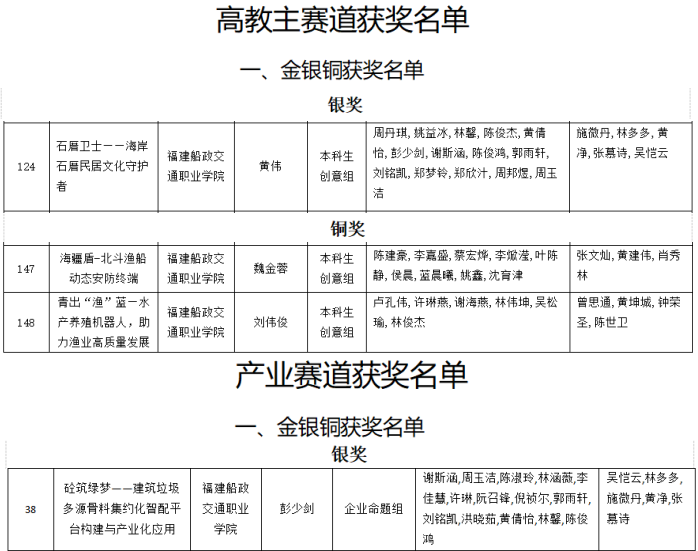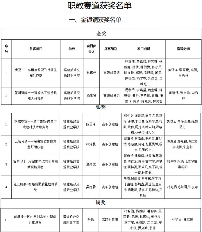 近日,根據(jù)“福建省教育廳關(guān)于公布福建省大學生創(chuàng)新大賽(2025)獲獎名單的通知(閩教高〔2025〕20號)”文件,我院在本屆大賽中榮獲2金6銀3銅的成績。其中,藍淵智眸——智能水下巡檢機器人開拓者和精衛(wèi)——高精度智能飛行救生圈供應(yīng)商兩個項目獲得福建省大學生創(chuàng)新大賽(2025)(職教賽道)金獎;砼筑綠夢——建筑垃圾多源骨料集約化智配平臺構(gòu)建與產(chǎn)業(yè)化應(yīng)用項目獲得產(chǎn)業(yè)命題賽道銀獎;石厝衛(wèi)士——海岸石厝民居文化守護者項目獲得高教主賽道銀獎。