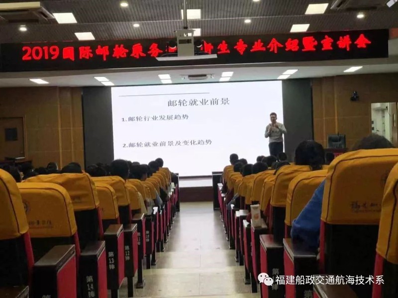 為使我系19級(jí)國(guó)際郵輪乘務(wù)新生能夠更快適應(yīng)大學(xué)生活,了解自己所學(xué)專業(yè),明確學(xué)習(xí)目標(biāo),增強(qiáng)學(xué)習(xí)動(dòng)力。航海技術(shù)系于2019年9月9日19點(diǎn)在一號(hào)樓學(xué)術(shù)報(bào)告廳開(kāi)展了“2019級(jí)國(guó)際郵輪乘務(wù)管理新生專業(yè)介紹暨宣講講座”。并邀請(qǐng)廈門(mén)海陸海事服務(wù)有限公司郵輪面試官李樂(lè)天先生、航海技術(shù)系副主任翁國(guó)玲老師和黃超夷老師參加本次宣講。